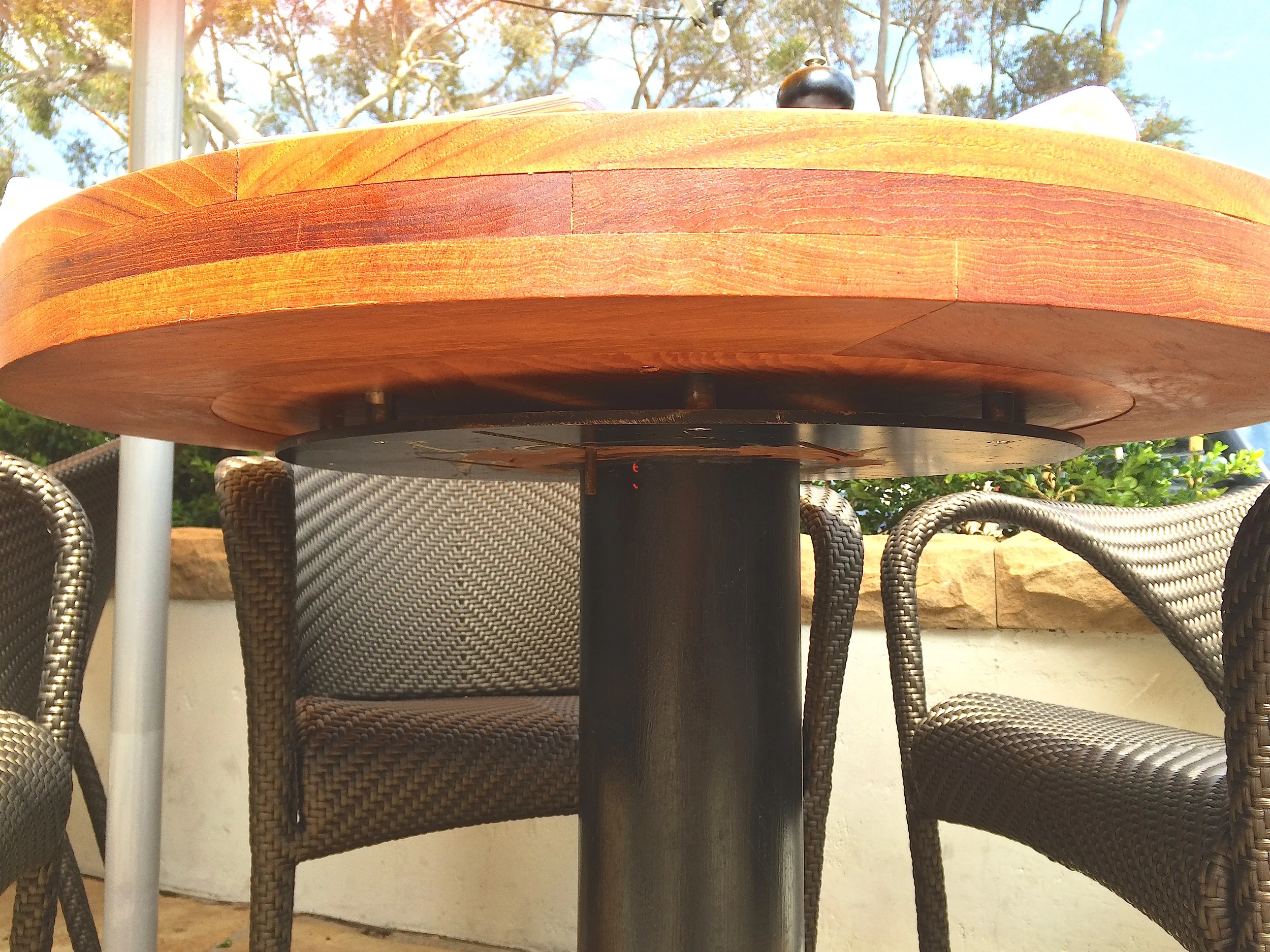 The picture above shows the pedestal of one of the outdoor tables. Not only is it a pedestal, it is also a heating element. The heat naturally generated by their refrigeration units is pumped through these and provides warmth in the evening through the vents.